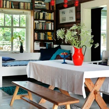 Köögipõrand on värvitud doominoruuduliseks, elutoa laiad lauad õhtuste udulaamade tooni, erkpunase lühtriga lagi helesiniseks. „Siin oli vanasti köök, oli must ja hästi nõgine lagi, seepärast jätsimegi köögi lae tumedaks. Võitlen kogu aeg iseendaga, aga ma vist võtan siiski järgmine aasta selle töö ette, et värvime selle lae ikka valgeks. Vahel on see hästi tume armas, aga kui tulevad sügise pikad õhtud, siis on kurb …”
