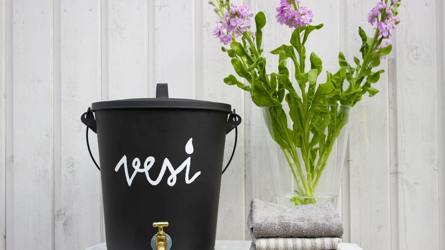 Mida tumedamat värvi ämber, seda soojemaks vesi suvel väljas seistes läheb! | foto: Laura LiinatNipiraamatu seekordses koduloos pole sisustamisega kunagi probleeme. Kõige ägedamad lahendused võluvadki nad välja vahenditest, mis parasjagu käepärast. Nii paelus meid näiteks välikäimlasse loodud leidlik kraaniga veepaak, mille tegemine on vaja kindlasti järele proovida!