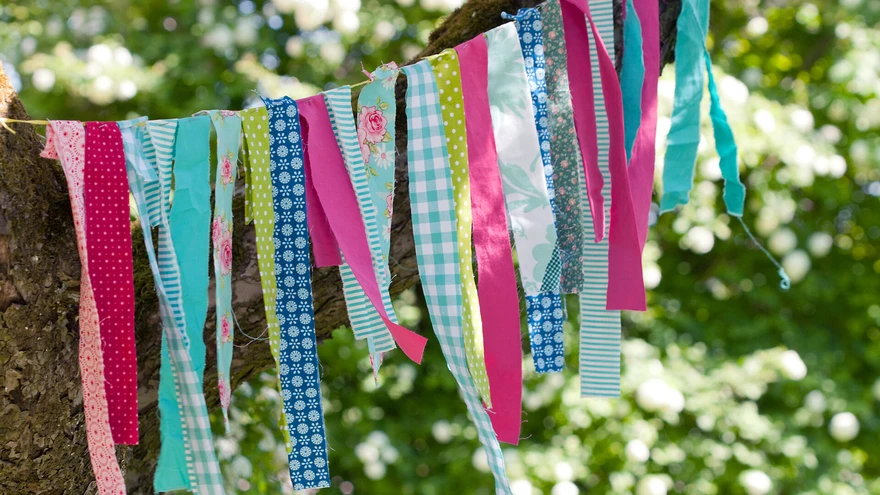 Lipukesed puudel määratlevad hästi aiapeo toimumise tsentri. Olgu siis elegantselt üht tooni või rõõmsalt kirjud. Lihtsad kaunistused saab vanast sitsikangast ribasid nöörile sõlmides.