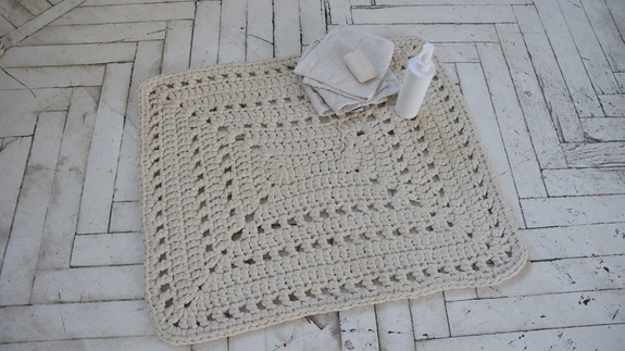 5. Kui vaip jääb liiga veninvaks, võid õmmelda sellele paksemast kangast (nt kotiriie) aluse, mis hoiaks detaile paremini paigal. Mõne detaili keskpunkti võid aluskanga külge kinni õmmelda, et vaip oleks terviklikum. Venivust aitab vähendada ka vaiba välisserva heegeldamine mõnest jäigemast kangast, nt linasest riidest.