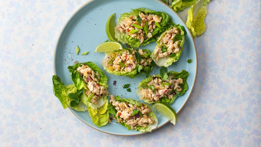 Tõsta hakklihasegu salatilehtedele vahetult enne söömist ja puista peale hakitud rohelist sibulat.