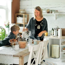 Küdeva ahju soojuskiirgus on seletamatult mõnus. Ei tea, kuidas seda füüsikaliselt seletada, aga nii see on. Lisaks ahjudele ja vanale pliidile – mis kodu keskel asuva suure köögi iga ilmaga hubase hoiab – on mugavamaks kütmiseks majja paigutatud ka soojuspump. Köögipliidi all hubiseb küll tihti tuli, kuid kaneelisaiu küpsetab siiski stiilne Smegi ahi.
