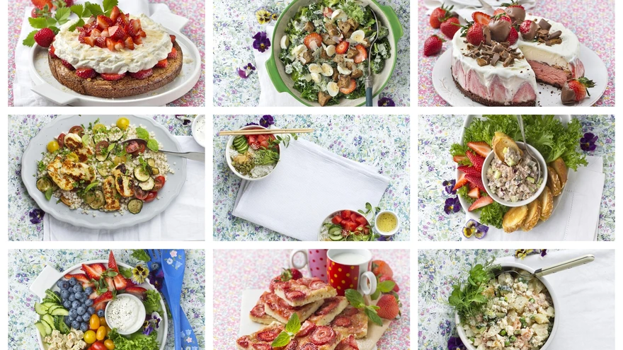 Suvised toidud | foto: kollaaž: (9 x Jaan Heinmaa)Salatilehed, köögiviljad, marjad – valik on nüüd lai ning kui kõike seda kombineerida omavahel või koos juustu, kala, liha või kanaga, loome hulga maitsvaid kergeid kooslusi. Suuremale seltskonnale tasub koostada vaagen, millel gruppidena salatiaineid ja topsiga kaste või lausa kaks.