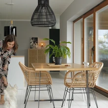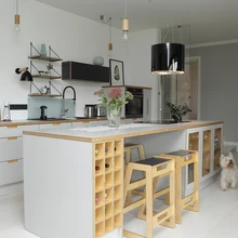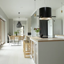 „Aasta otsa ei leidnud me köögisaare taha õigeid toole, istusime taburettide peal. Õiged pukid saabusid viivitusega, sest Klavis Mööblil tuli uus toode välja,” räägib Merlyn. Kuna abikaasa Marek soovis, et pliit oleks köögisaarel ja ahi kõrgemal, siis tekkis probleem kubu valikuga. „Neist kulgevad välja enamasti koledad voolikud või torud, aga meil õnnestus leida väga dekoratiivne söefiltriga kubu, mis on ühtlasi nagu kena lamp. Tellitud valge asemel tuli must, mis sobib isegi paremini. Vahel võib vale toode hoopis õigemaks osutuda.”