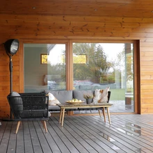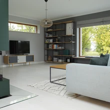 Tutvustaval ringkäigul assisteerib perenaist West Highlandi terjer Bruno-Bert, meenutades valget lumepalli, mis tuhiseb läbi maja. Tundub, et Brunolegi meeldib väga pererahva mõte lasta ümbritsev loodus läbi suurte klaaspindade ruumi sulanduda, sest tema saab nii ka lamades kirglikult peilida linde ja juhuslikult aeda sattuvaid loomi. Samuti lipsata erinevate tubade ustest avarale lõuna- ja läänesuunalisele terrassile.
