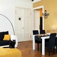 Kohe algul kujutas Maiken ette, mida siinne ruum eriti hästi võimaldaks. Kindlasti soovis ta näha klassikalisemat stiili, toonidest kulda ja musta. „Tahtsin suurt vannituba ja garderoobi, musta kööki nägin juba vaimusilmas. Klassikalise stiiliga kõrvutasin ka tänapäevast.“ Must plaat oli julge otsus, kuna seda peab üsna palju pesema, teab perenaine nüüd. Must köök pakub aga vanas majas võluvat kontrasti modernse maailmaga. Samasugust kuldset plaati, nagu on köögis, kasutas ta ka vannitoas, see muudab terviku rahulikumaks. Kõige suurem mõistatus oli see, kuidas pääseks mõlemasse tagatuppa, ilma et peaks teisest läbi minema, meenutab Maiken keerulisemaid ülesandeid. Nii sündis väike vaheesik, mida ehib nüüd kaasale sünnipäevaks tehtud suur maal.