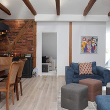 „Mika ja Mari saatsid näidispildid, et nad soovivad Skandinaavia stiilis korterit,” meenutab Anneli. „Aga sellisesse vanasse, tellisseinte, hiiglakõrgete lagede ja laetaladega majja Skandinaavia stiil lihtsalt ei sobi. Tegin oma lahendused ning läkitasin pildid ja joonised, kuidas mina selle korteri teeksin. Lisasin värve, valgusteid jms detaile. Saatsin ka esiku ja köögimööbli joonised ning pildid, millised need võiksid olla.” Anneli sai Mikalt napi vastukirja: „Sobib.”