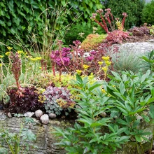 Suurt kiviplokki katab nüüd kukeharjade värvikas vaip. Kivi päikeselisel küljel on maapinnal pojengid, varjupoolel metspipar. Nii sai koledast pilguhäirijast hoopis põnev ja värvikas aiaelement, mis sulandub tänu peal ja ümber olevatele taimedele harmooniliselt muu aiaga kokku. Kukeharjavaip on värviline kogu aasta ringi, isegi talvel.