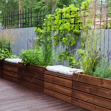 Terrassikastides kasvavad ka hostad, võrratult lõhnav tähklavendel, meliss ja mündid. Väga õnnestunud valik on elu- ja aiamaja ning plankaia sinakashall värvitoon. See mõjub pehmelt ning toob oma taustal taimed hästi esile.