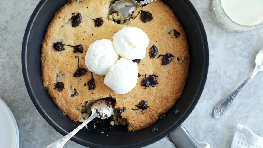 Šokolaaditräpsuline panniküpsis | foto: Kristi RebaneSuure panniküpsisega hoiad palju aega kokku, sest pääsed väikeste küpsiste vormimisest. Šokolaadi asemel sobivad tainasse ka muud lisandid, näiteks röstitud ja hakitud pähklid, lusikatäis kookoshelbeid või poole apelsini riivitud koor. Pane küpsis ahju küpsema üleni metallist või malmist praepannile, aga sobib ka koogivorm või ahjuplaat.