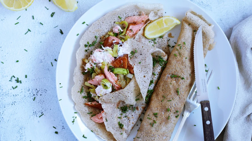 Toorjuustu ja lõhega tatrapannkoogid | foto: Kristi RebaneVaid toortatrajahust, veest ja munast valmivad ülepannikoogid on gluteenivabad ja mõnusalt pähklise maitsega. Tainas saab ideaalse konsistentsi, kui teed selle valmis päev enne kookide küpsetamist, nii et see saab üle öö külmkapis paisuda.