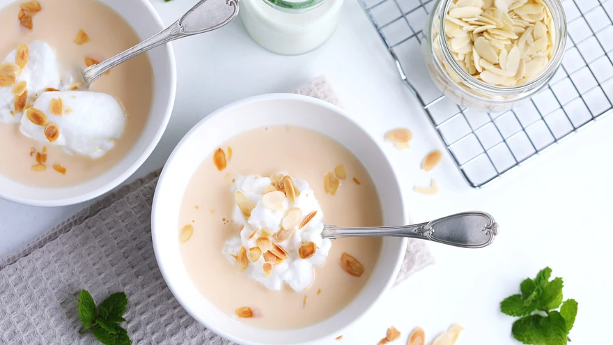 | foto: Kristi RebaneKreemjal vanillikastmel ujuvad õhulised munavahupilvekesed tõepoolest meenutavad kohevaid hangi.Magustoidule lisavad tekstuuri ja pidulikkust röstitud mandlilaastud. Serveerimisel võid kaussidesse puistata ka mõned marjad.