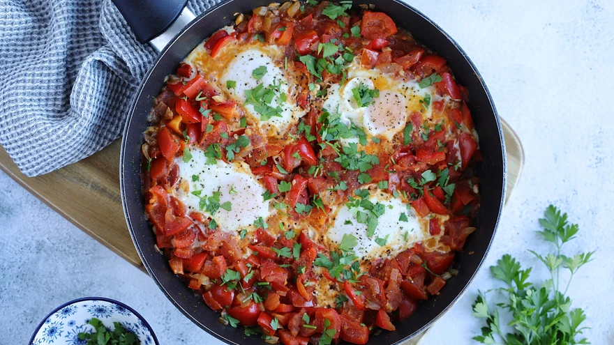 Lihtne shakshuka kodumaiste tomatitega | foto: Kristi RebaneVahva nimega shakshuka on Tuneesia juurtega ja Lähis-Idas levinud tomati-paprika panniroog, kuhu enne valmimist lüüakse küpsema munad. See mõnusalt toitev ja vaid viiest koostisosast koosnev shakshuka valmib eriti kiirelt. Soovi korral puista serveerides roale fetat või mõnd muud juustu. Ära unusta laualt ka värsket saia, millega tummine soust taldrikult kätte saada.