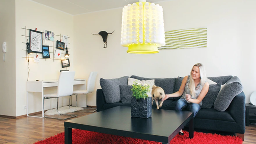 Liikumisruumi hoidmiseks valiti kirjutuslauaks kitsas töölaud Micke (IKEA-st), millele sülearvuti kenasti ära mahub. Diivanilaud on see-eest piisavalt suur, et mahutada vajadusel enam kui pelgalt telepulti ja teekruusi. | foto: Juta KübarseppVõistluse Kodu Kauniks 2013 noore kodu preemia, 1500 € Hemtexilt pälvisid Karin Karma ja Rivo Aedma, kelle oskuslikult planeeritud ja mänguliselt kujundatud ühetoalist korterit täiendasid disainiideed. Et end kodus hästi tunda, ei ole tingimata vaja rohkelt ruutmeetreid, tõestab Karini ja Rivo väike, aga otstarbekas korter Kakumäe roheluses.