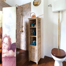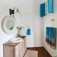 Nii on maja sisustatud lähedalt ja kaugelt toodud ideede ja esemetega. „Näiteks tualettruum sai alguse valamust, mille lapsed tõid Marokost. Vürtsiks on ka meie endi kätetööd, mis sisaldab meie hinge ja aega,” kirjeldab Reet sisustusdetailide valikut. „Varem soetatud inglikujukestega peegliraam nõudis sobiva stiiliga kraanikaussi, mille Liisu Arro meile ka tegi. Vanast kodust võtsime kaasa põhiliselt raamatud ja maalid, mis on meile väga olulised ja igaühel neist on oma lugu. Oleme väga palju erinevaid asju kokku sobitanud. Näiteks Barcelonast kaasa toodud kristallvalgustite ja sealselt turult ostetud kraani kõrval on Balti jaama turult soetatud rätikuhoidja.”