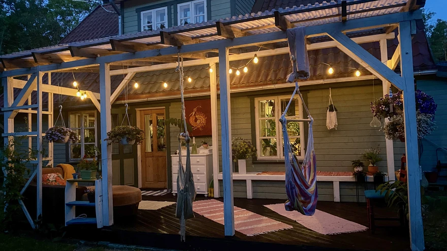 Katusealusel on oluline roll kaitsta ilmastiku eest. Pimedamaid õhtuid ja öid kaunistavad lambiketid ja hubane sisustus. | foto: Adobe StockIlusad ilmad ja puhkuseaeg kohe tõmbavad kogu eluga õue kolima. Väikesed muudatused ja täiendused siin-seal aias ning võidki sügiseni õues olla!