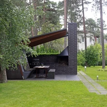 Kena välimuse ja nutika lahendusega on ka varjualuse all olev väliköögiga istumiskoht. See toimib ühtlasi panipaigana: nimelt on ära kasutatud istekohataguse kaldseina taha jääv ruum, kus saab hoida muruniidukit ja muud kola, samuti ahjupuid. Kõik vajalik on käepärast ja samas silma alt ära.